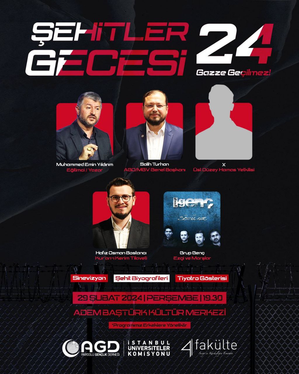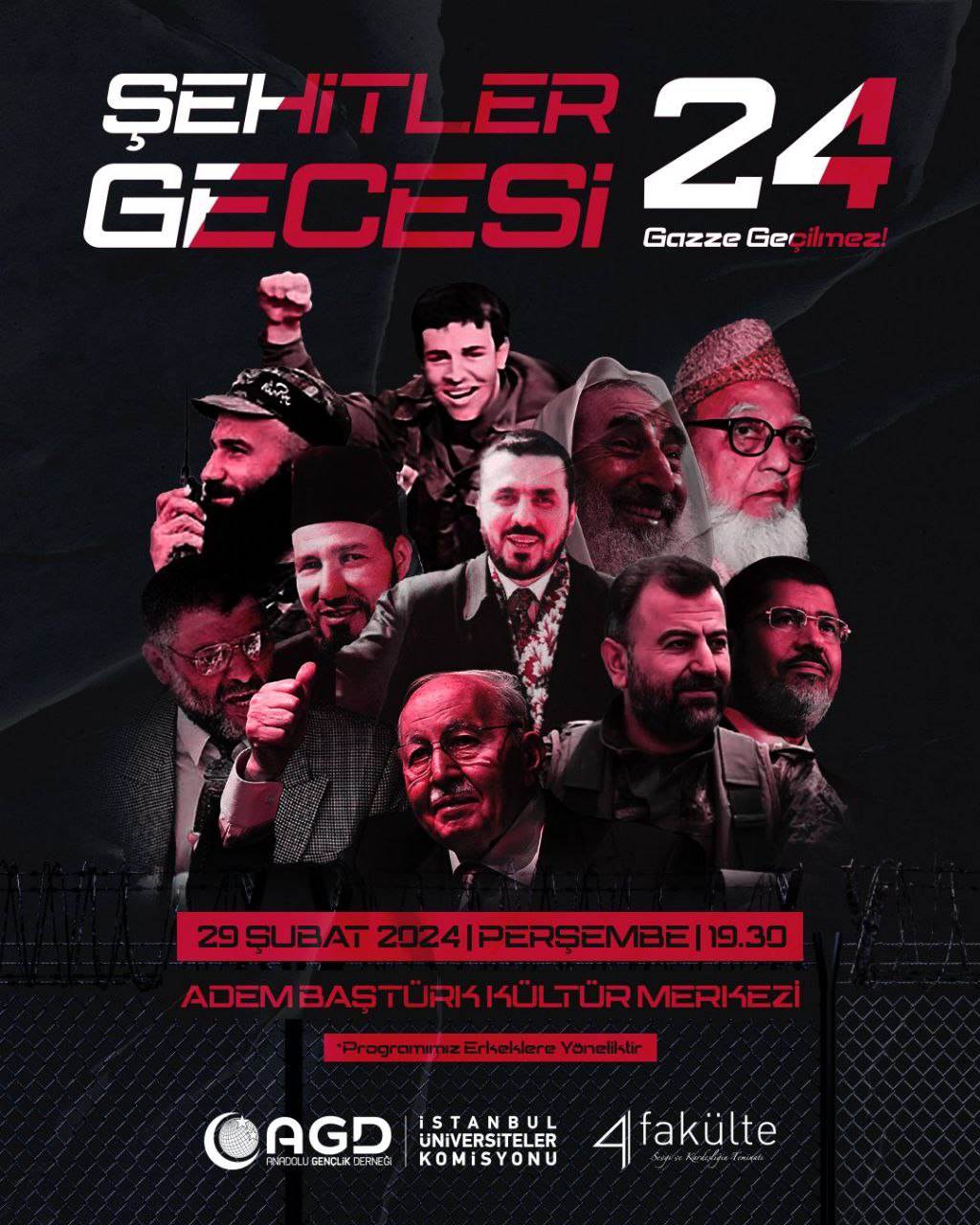 23'üncüsünü gerçekleştireceğimiz Şehitler Gecesi programımız bu sene "Gazze Geçilmez!" mottosuyla 29 Şubat Perşembe günü saat 19.30'da Prof. Dr. Adem Baştürk Kültür Merkezinde gerçekleştirilecektir.