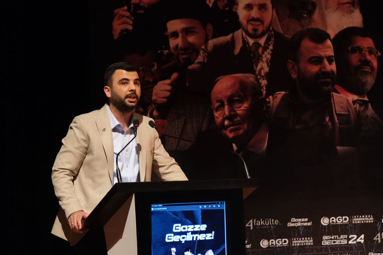 AGD İstanbul Şube Başkanımız Mehmet Yaroğlu Bey'de Şehitler Gecesi'24 programımızda katılımcılara hitap etti. İstanbul İl Başkanımız Mehmet Yaroğlu Bey, "El-Hak, Gazze geçilmeyecektir çünkü sadece 40 bin Kassam Tugayı Gazze'yi müdafaa etmiyor. Gazze'yi yalnızca Filistin Direnişinin asil evlatları müdafaa etmiyor. Gazze'nin, Pakistan'da da ordusu var. Gazze'nin, Malezya'da da ordusu var. Gazze'nin, İran'da da ordusu var. Gazze'nin, Lübnan'da da ordusu var ve Gazze'nin bugün burada olduğu gibi Türkiye'de de kutlu hilafetin düşmüş olduğu bu belde de ordusu var, Allah'ın izniyle. Biz inanıyoruz ve biliyoruz ki; bu ordu yalnızca Gazze'yi müdafaa ordusu değildir; bu ordu Aşkelon'u da geçecek, Hayfa'yı da geçecek ve Allah'ın izniyle, Tel-Aviv'i de geçecektir. Bu ordu, o işgal rejimini, o kasıp yahudi varlığını, o mübarek topraklardan silip atacak, Allah'ın izniyle." ifadelerini kullandı.